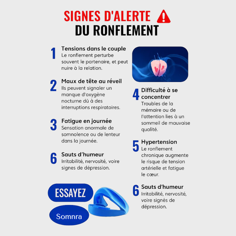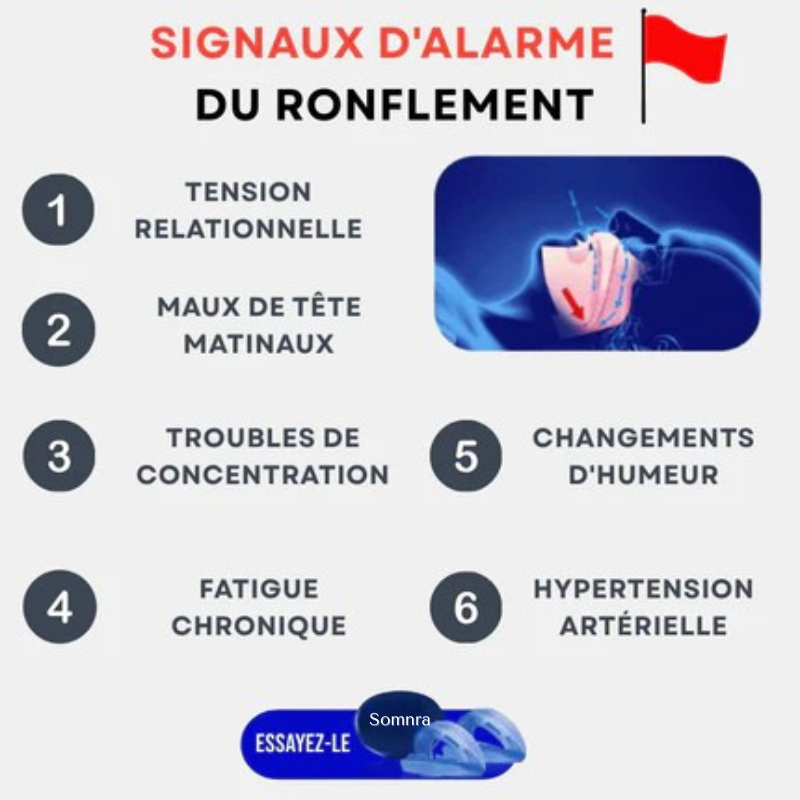 Des nuits calmes et silencieuses : Somnra libère vos voies respiratoires, réduisant naturellement les ronflements dès la première nuit.